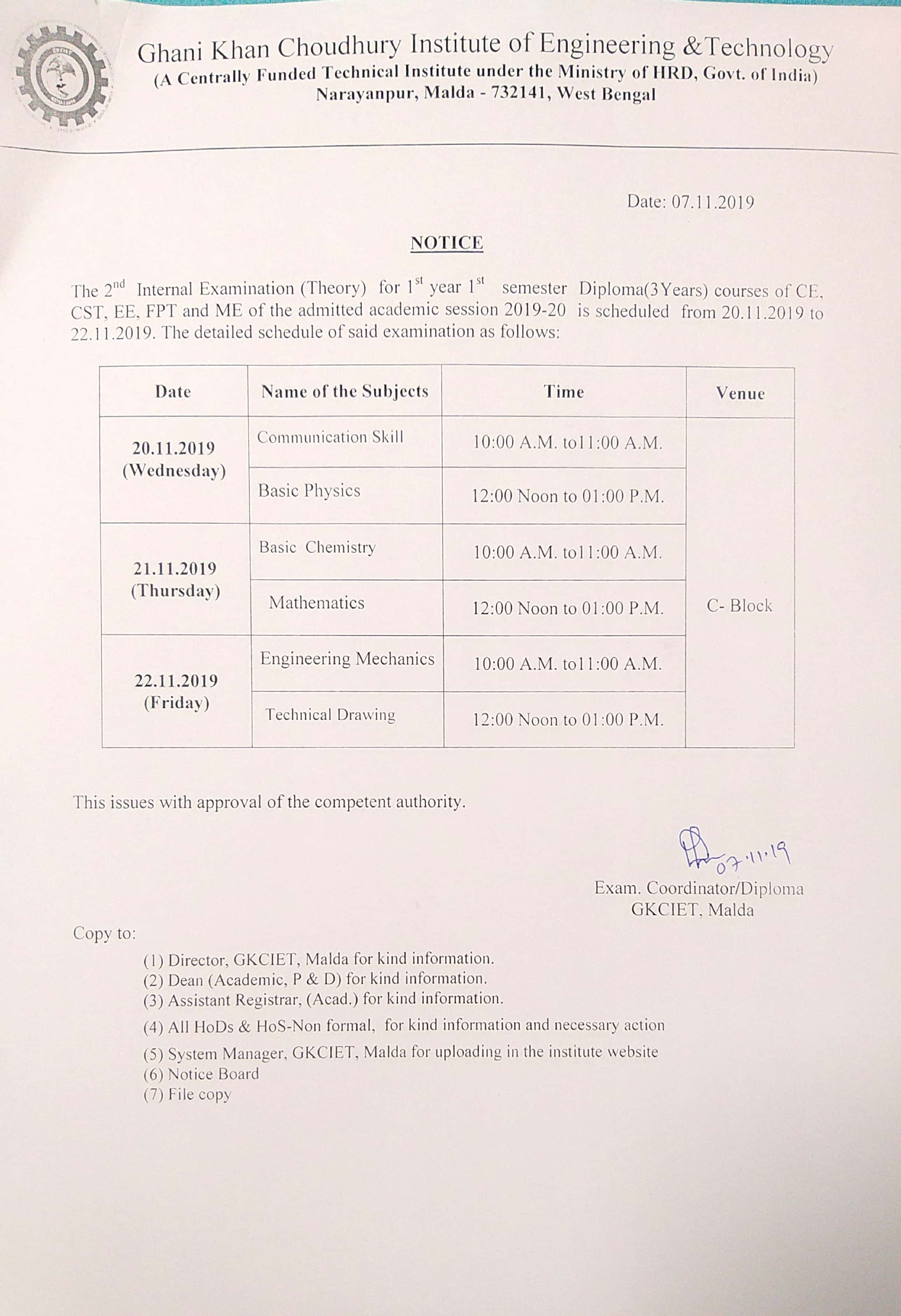 Notice for Internal Exam(Theory) for 2nd year Diploma