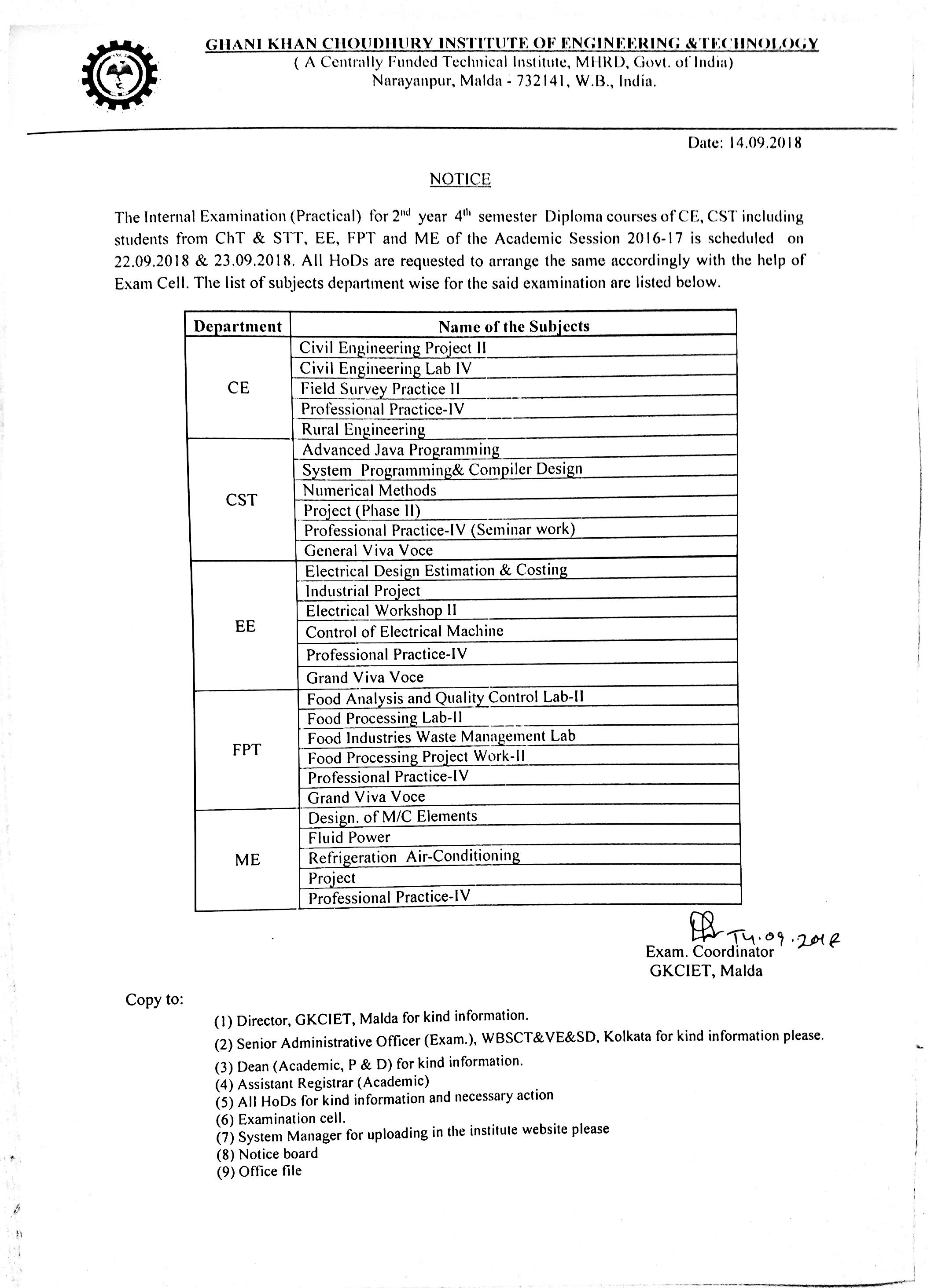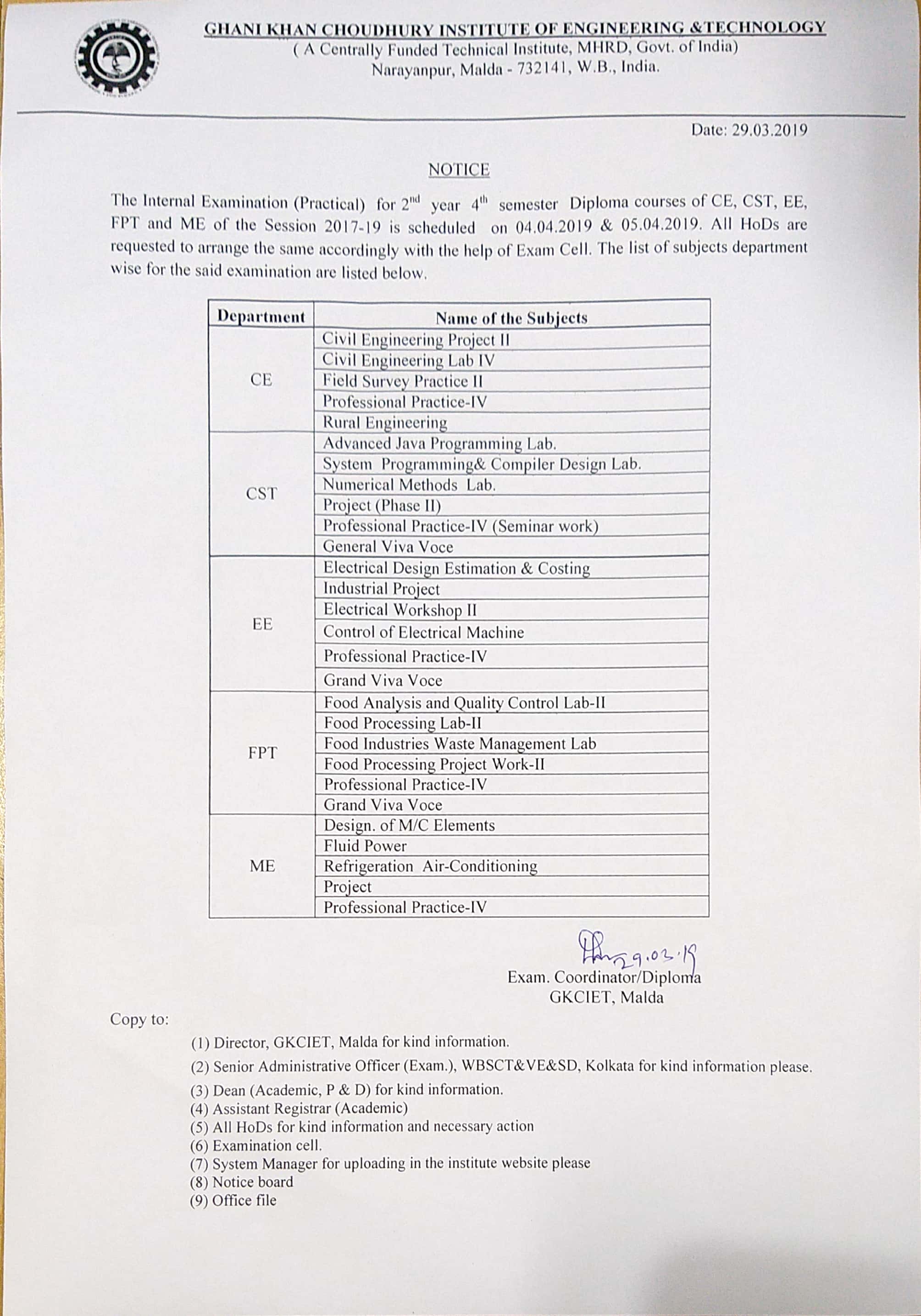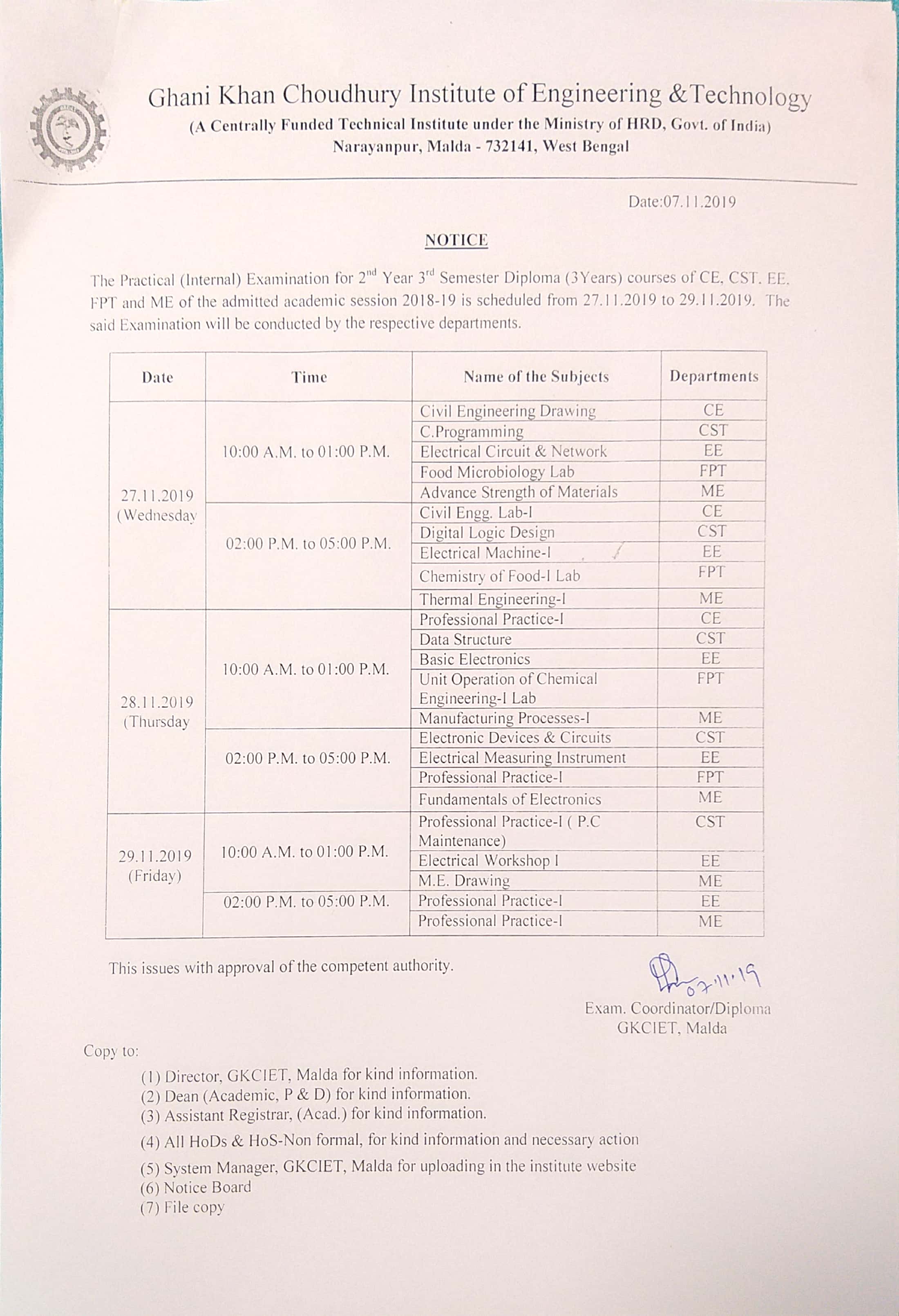Notice for practical (Internal) exam of Diploma 2rd Year 4th Sem
