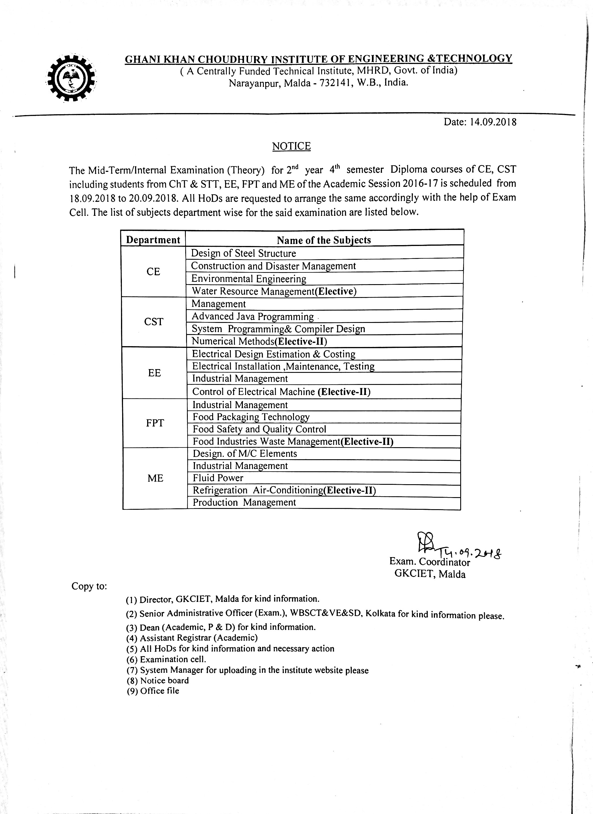 Notice regarding Mid-Term Exam (Diploma in CE,CST,EE,FPT,ME) –Jun-2018