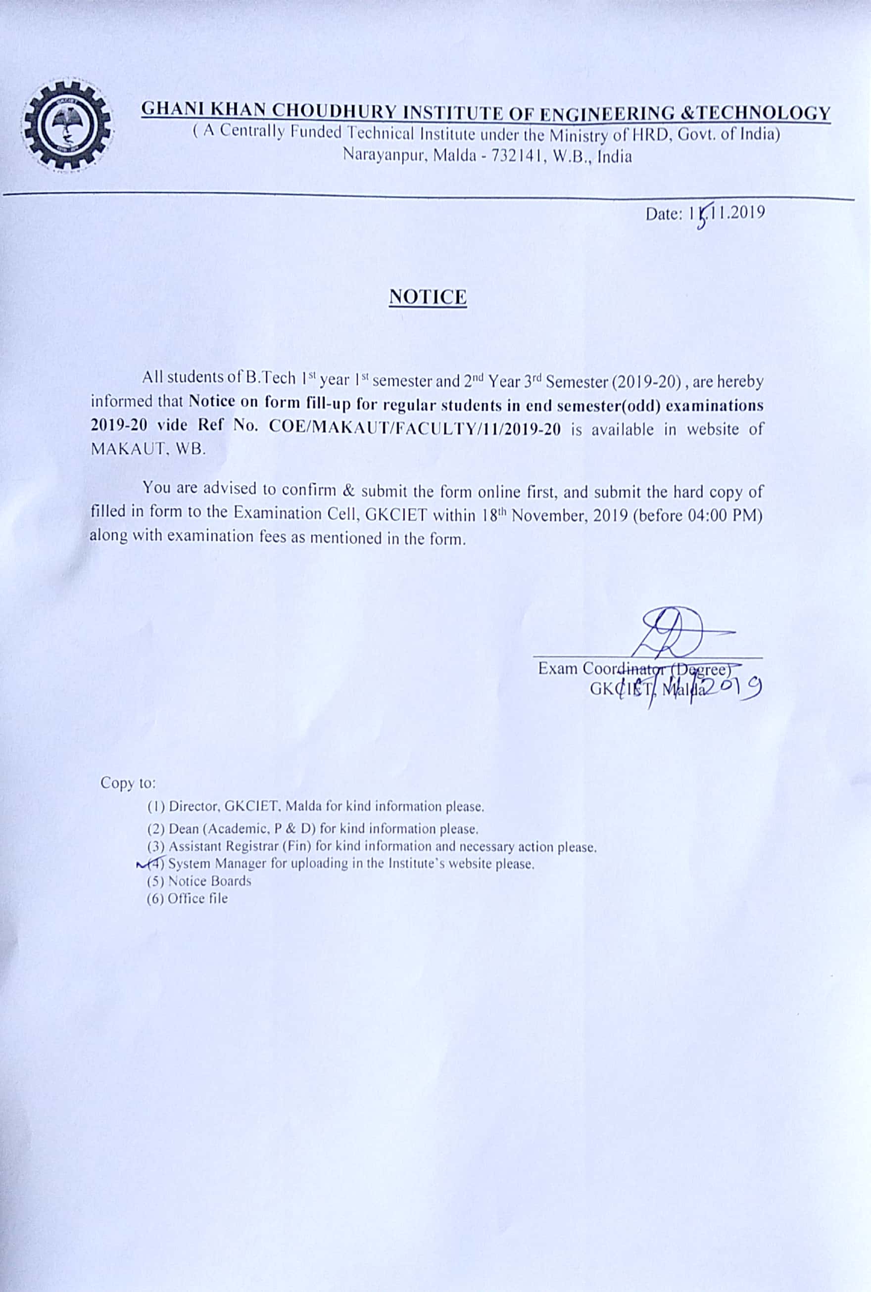 Notice on form fill-up for regular students in end semester (odd) Examinations 2019-20