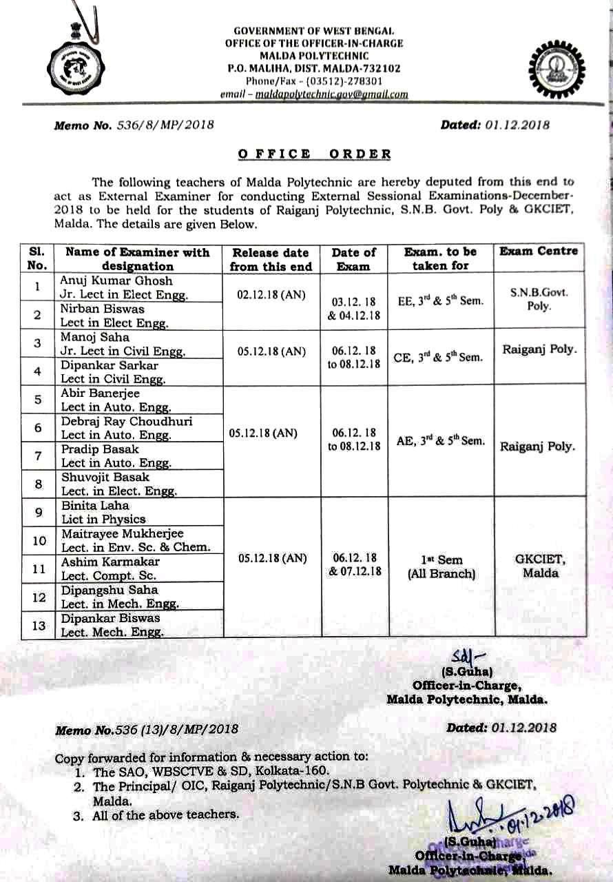 Notice for End Semester Examination (Theory) for Diploma course 2nd year 3rd semester of the session 2017-19