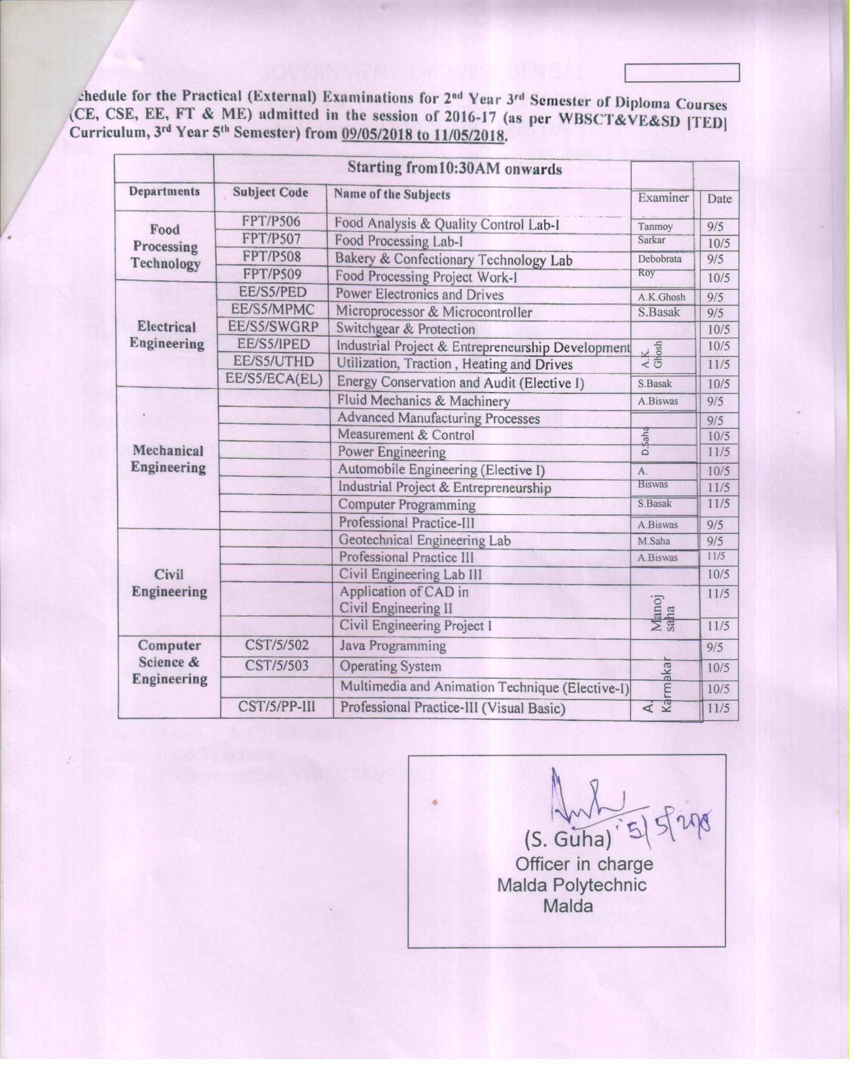 Schedule for the Practical (External) Exam of 2nd Year Diploma