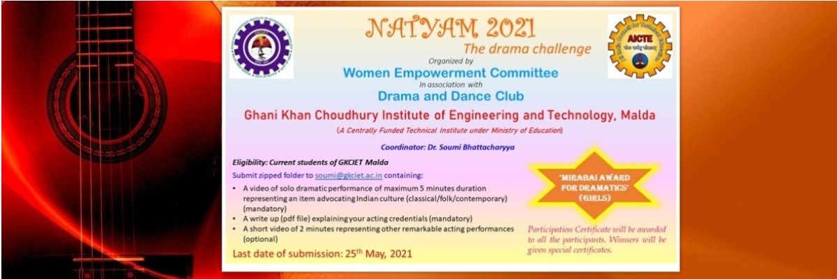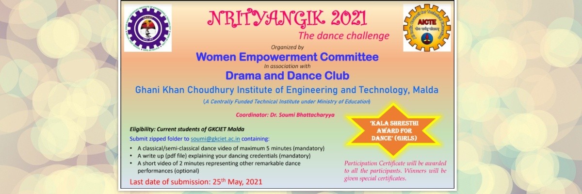 Ghani Khan Choudhury Institute of Engineering and Technology (GKCIET), Malda has started this Drama & Dance Club with Dr. Soumi Bhattacharyya (Assistant Professor) as Convener and would welcome all interested students and staffs to enroll as its members. We would like our Drama & Dance Club members to perform in cultural programmes and also to participate in intra-college and inter-college competitions and would encourage in all possible ways.