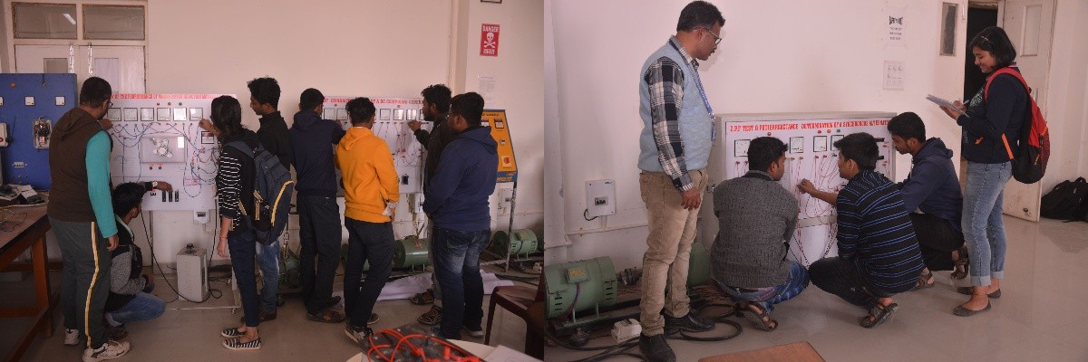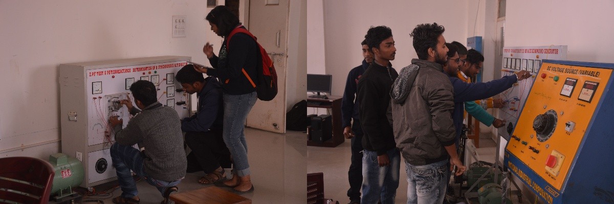 The electrical machines lab is an integral part of the Electrical Engineering Department. Electrical machines can change electrical energy to mechanical energy and vice versa in a good control manner; therefore, it plays an important in the range from industry uses to household appliances used in day-to-day life. The various real-world applications like electrical power generation, change of voltage level, Electric traction, home appliances, and operation & control of various apparatus and instruments where electrical machines are extensively used. The integration of Power electronics, microprocessors, and modern control system principles along with the electrical machine create a building block of various applications and research scope. This lab is equipped with a display model for different parts of the electrical machine; the Experimental setup of both AC and DC machines, as per the syllabus, maintains all safety and protection, transformers, speed sensors, current sensors, and computers with MATLAB software and various measuring tools and equipment. This lab offers an outcome-based teaching-learning environment for students and researchers. This Electrical machine lab facilitated students to transform classroom theoretical knowledge into a hands-on practical experience with the cooperation of experts faculties and Technical assistants.